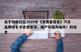 关于特斯拉在2026年《消费者报告》汽车品牌排名中逆袭登顶,国产车压力山大!的信息